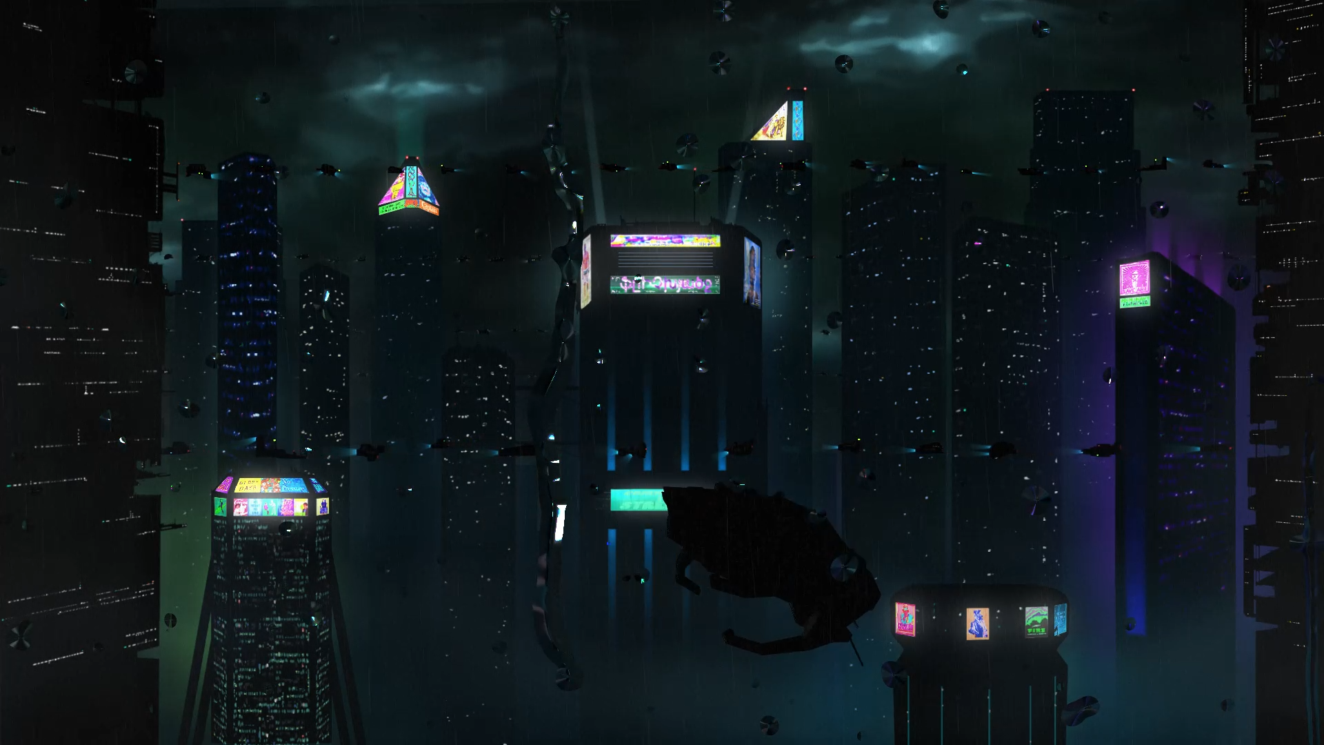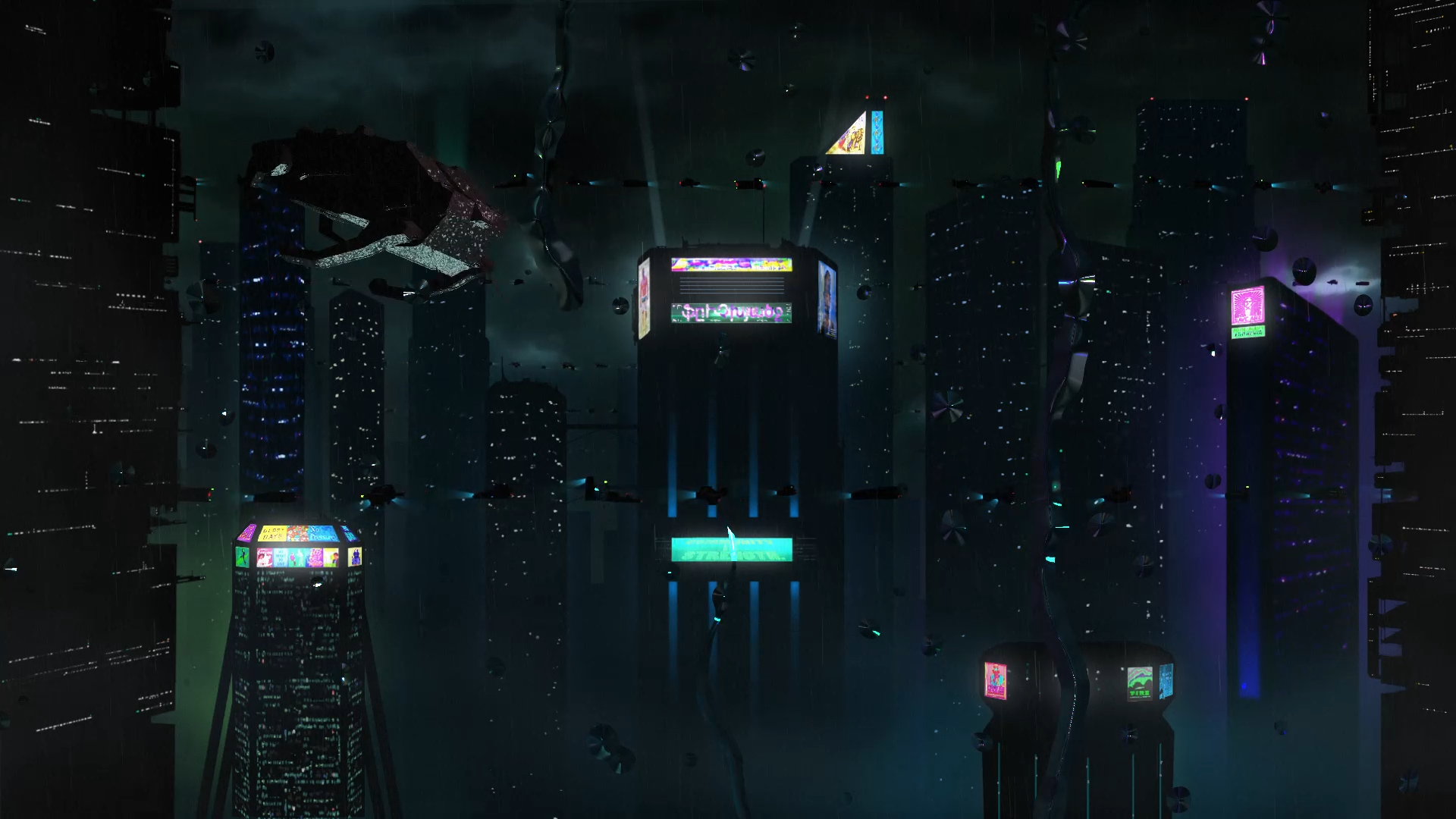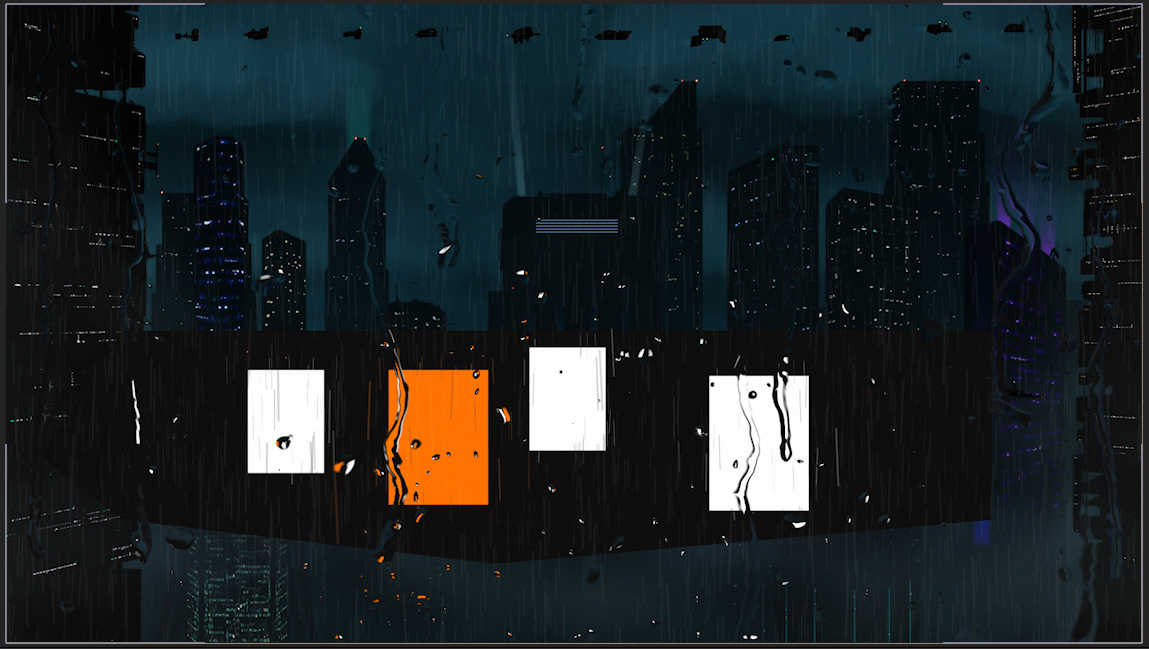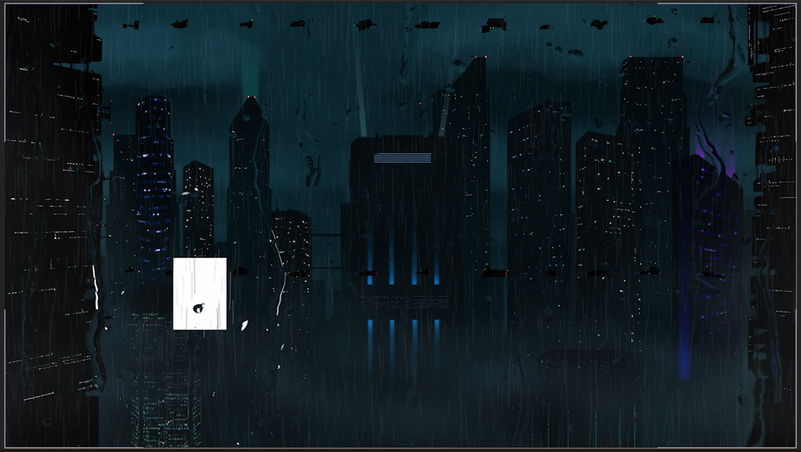 Eine futuristische Stadt mit Wolkenkratzern in einem düsteren verregneten Setting. Die Illustrationen wurden mit Photoshop erstellt und die ganze Szene mit After Effects zum Leben erweckt.