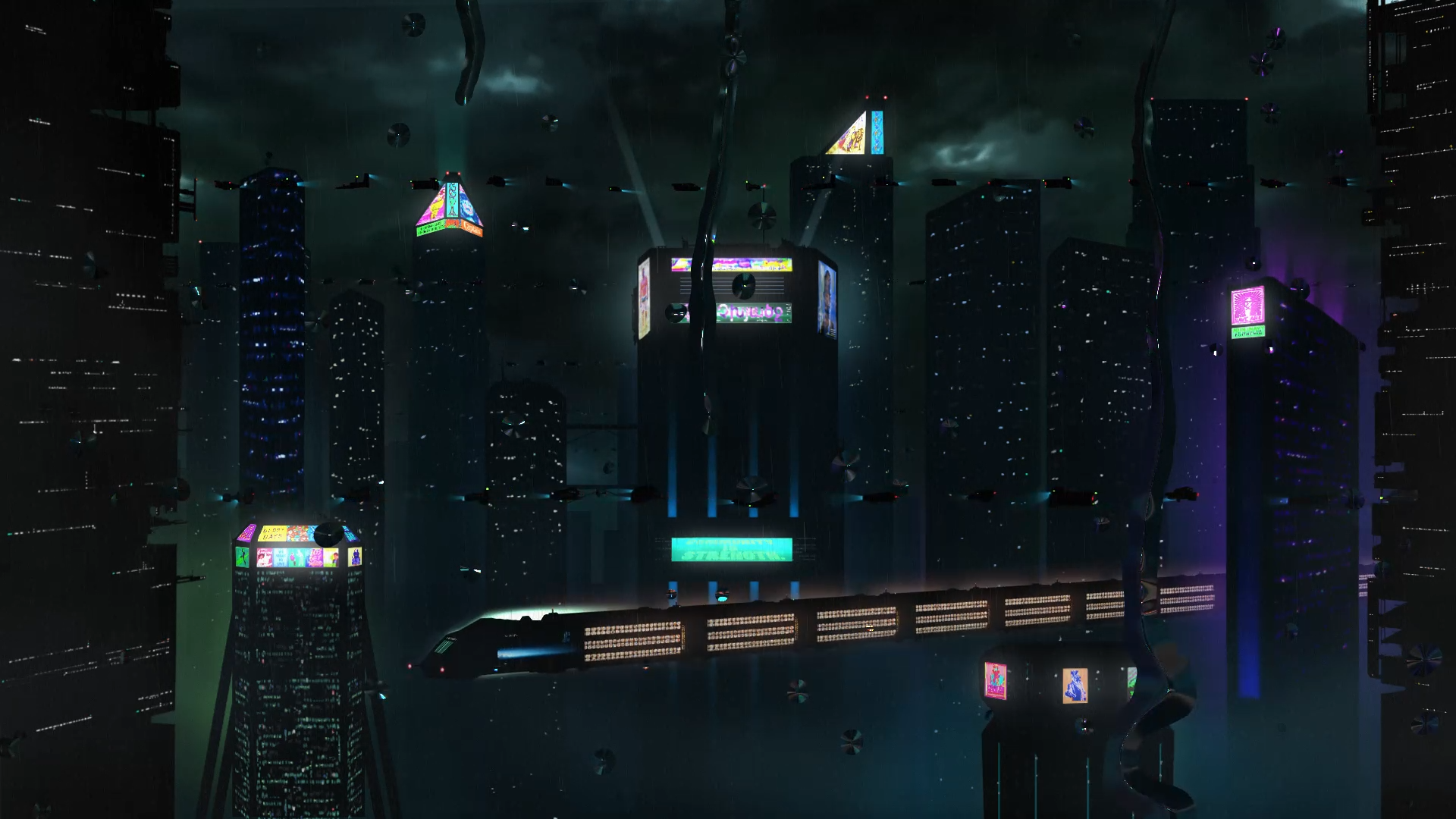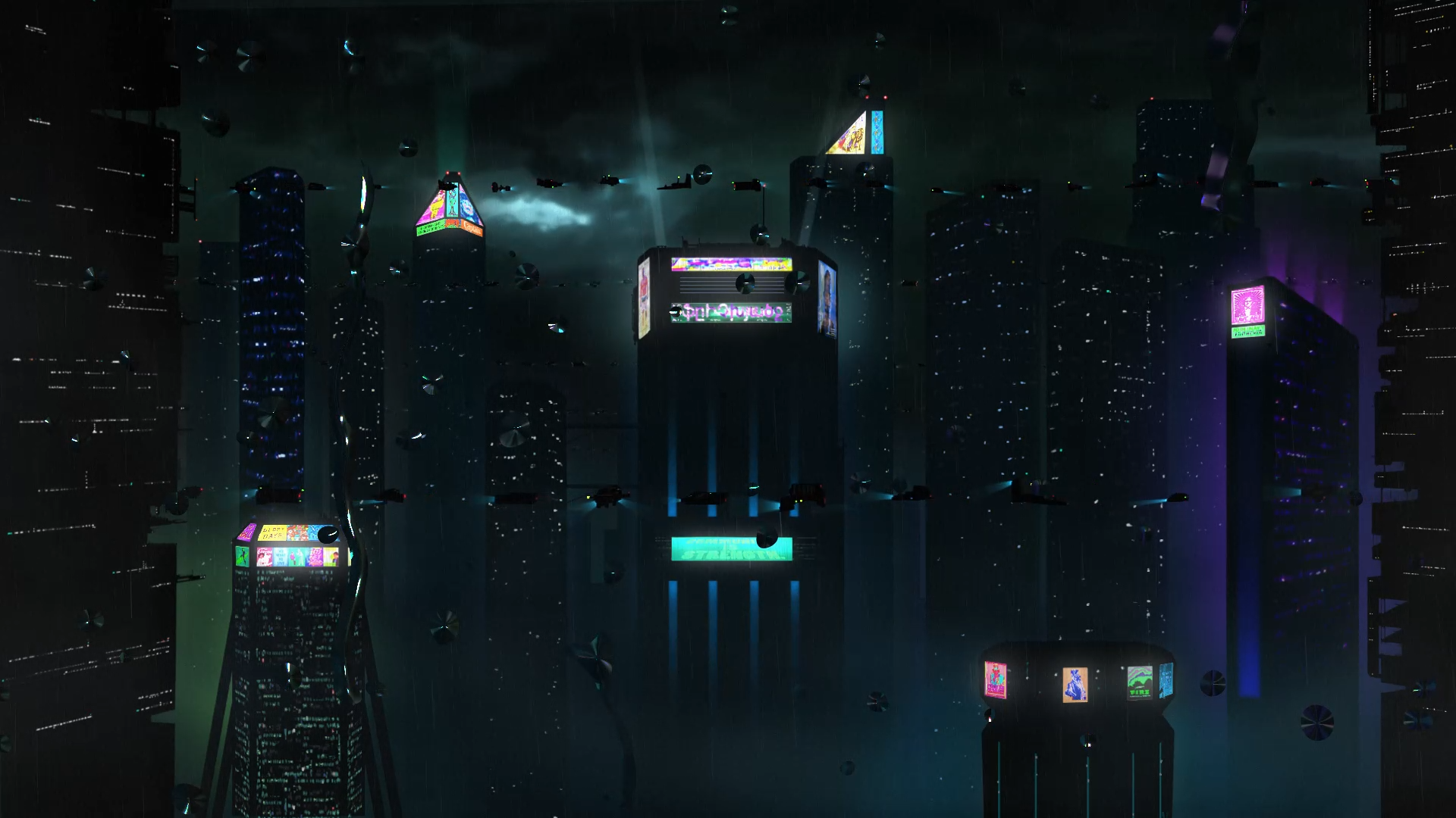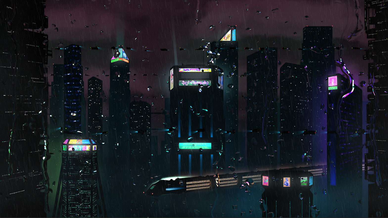Eine futuristische Stadt mit Wolkenkratzern in einem düsteren verregneten Setting. Die Illustrationen wurden mit Photoshop erstellt und die ganze Szene mit After Effects zum Leben erweckt.